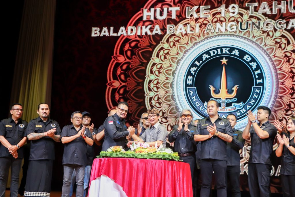 Mewakili Bupati Badung, Sekretaris Daerah Badung I Wayan Adi Arnawa menghadiri serangkaian puncak HUT Baladika Bali Ke-19, bertempat di Gedung Balai Budaya Giri Nata Mandala, Puspem Badung, Jumat (5/5). Puncak HUT ditandai dengan pemotongan tumpeng dan turut dihadiri anggota DPR RI I Gusti Agung Rai Wirajaya, anggota DPRD Badung Made Yudana, Lanang Umbara, Wayan Regep, Made Suwardana, Putu Yunita Oktarini, Made Suryananda, Ketua Umum Baladika Bagus Alit Sucipta, Ketua Harian Baladika, Ketua Dewan Pembina Baladika, Ketua Dewan Penasehat Baladika beserta anggota, Ketua Umum Laskar Bali Shanti AA Suma Widanta (Gung Alit) serta jajaran pengurus dan anggota.
