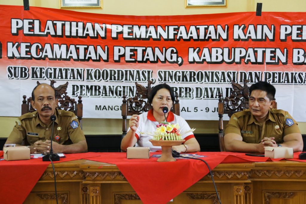 Sementara Kabid Pembangunan Pemberdayaan Industri I Gusti Ngurah Suardika melaporkan kegiatan ini akan berlangsung selama 5 hari kedepan dari tanggal 5-9 Juni 2023 serta akan diikuti oleh 10 orang peserta dari perwakilan desa yang ada di Kecamatan Petang. Kegiatan ini merupakan upaya menumbuh kembangkan serangkaian pemberdayaan industri dan menengah yang ada di kabupaten badung yang tentunya dilandasi oleh semangat dan tekad untuk mengembangkan industri kecil dan menengah agar produktif di tengah persaingan global saat ini. Kegiatan pelatihan pemanfaatan kain perca juga sangat penting dilakukan disamping juga untuk mengurangi pencemaran lingkungan atau limbah yang berupa potongan kain yang dihasilkan oleh pengusaha penjahit yang ada di kabupaten badung dan nantinya melalui pelatihan ini hasil limbah ini mampu diolah menjadi kerajinan seperti ikat rambut dengan berbagai variasi yang mempunyai kualitas sehingga mampu diserap di pasaran.