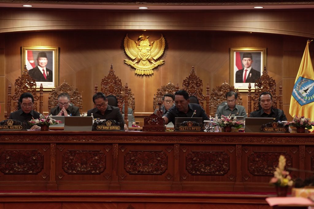 Pelaksana Tugas (Plt) Bupati Badung I Ketut Suiasa menghadiri Sidang Paripurna Kelima Masa Persidangan Pertama DPRD Badung Tahun 2024 dengan agenda Penjelasan DPRD terhadap tiga Rancangan Peraturan Daerah (Raperda) inisiatif DPRD tentang Penyelenggaraan Pendidikan Wawasan Kebangsaan, Desa Wisata, dan Perlindungan dan Pemberdayaan Usaha Mikro yang dirangkaikan dengan Pemandangan Umum Fraksi-Fraksi terhadap Rancangan Peraturan Daerah (Ranperda) tentang Anggaran Pendapatan dan Belanja Daerah (APBD) Tahun Anggaran 2025, Rabu (30/10) bertempat di Ruang Sidang Utama Gosana Kantor DPRD Badung.
