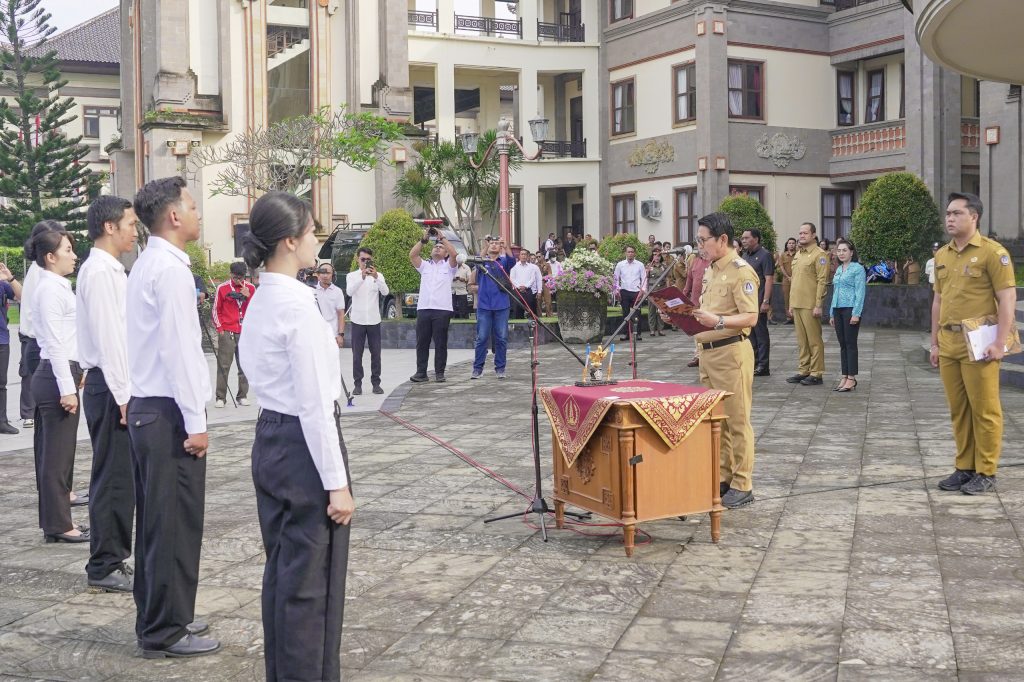 Bupati Badung I Wayan Adi Arnawa mengambil sumpah dan melantik sebanyak 587 orang Calon Pegawai Negeri Sipil (CPNS) dan 4.922 Pegawai Pemerintah Dengan Perjanjian Kerja (PPPK) di lingkungan Pemkab Badung, di Lapangan Mangupraja Mandala, Puspem Badung, Senin (26/5). CPNS dan PPPK tahap I hasil seleksi pengadaan ASN tahun 2024 ini juga menerima Surat Keputusan (SK) Pengangkatan dan menandatangani Pakta Integritas serta Penandatanganan Perjanjian Kerja secara simbolis bagi perwakilan PPPK. Hadir pada kesempatan tersebut, Wakil Bupati Badung Bagus Alit Sucipta, Ketua DPRD Badung I Gusti Anom Gumanti, Kepala Kantor Regional X BKN Denpasar Yudhantoro Bayu Wiratmoko, Pimpinan Perangkat Daerah, Ketua TP PKK Badung Ny. Rasniathi Adi Arnawa bersama Sekretaris I TP PKK Ny. Yunita Alit Sucipta serta Ketua Gatriwara Badung Ny. Ayu Trisna Dewi Anom Gumanti.