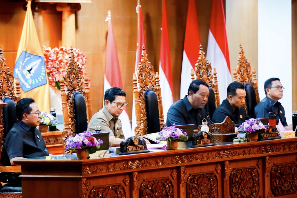 Bupati Badung I Wayan Adi Arnawa menghadiri Rapat Paripurna masa persidangan ketiga dengan Agenda Penyampaian Pandangan Umum Fraksi-Fraksi terhadap Rancangan Peraturan Daerah (Raperda) tentang Rencana Pembangunan Jangka Menengah Daerah (RPJMD) Semesta Berencana Kabupaten Badung tahun 2025-2029 serta Raperda tentang Perubahan Perda Nomor 7 tahun 2023 tentang Pajak Daerah Dan Retribusi Daerah, bertempat di Ruang Sidang Utama Gosana Kantor DPRD Badung, Senin (28/7).